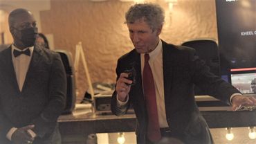 As an aged Thomas Kling talks to a young public educator, Mekita Matthews,